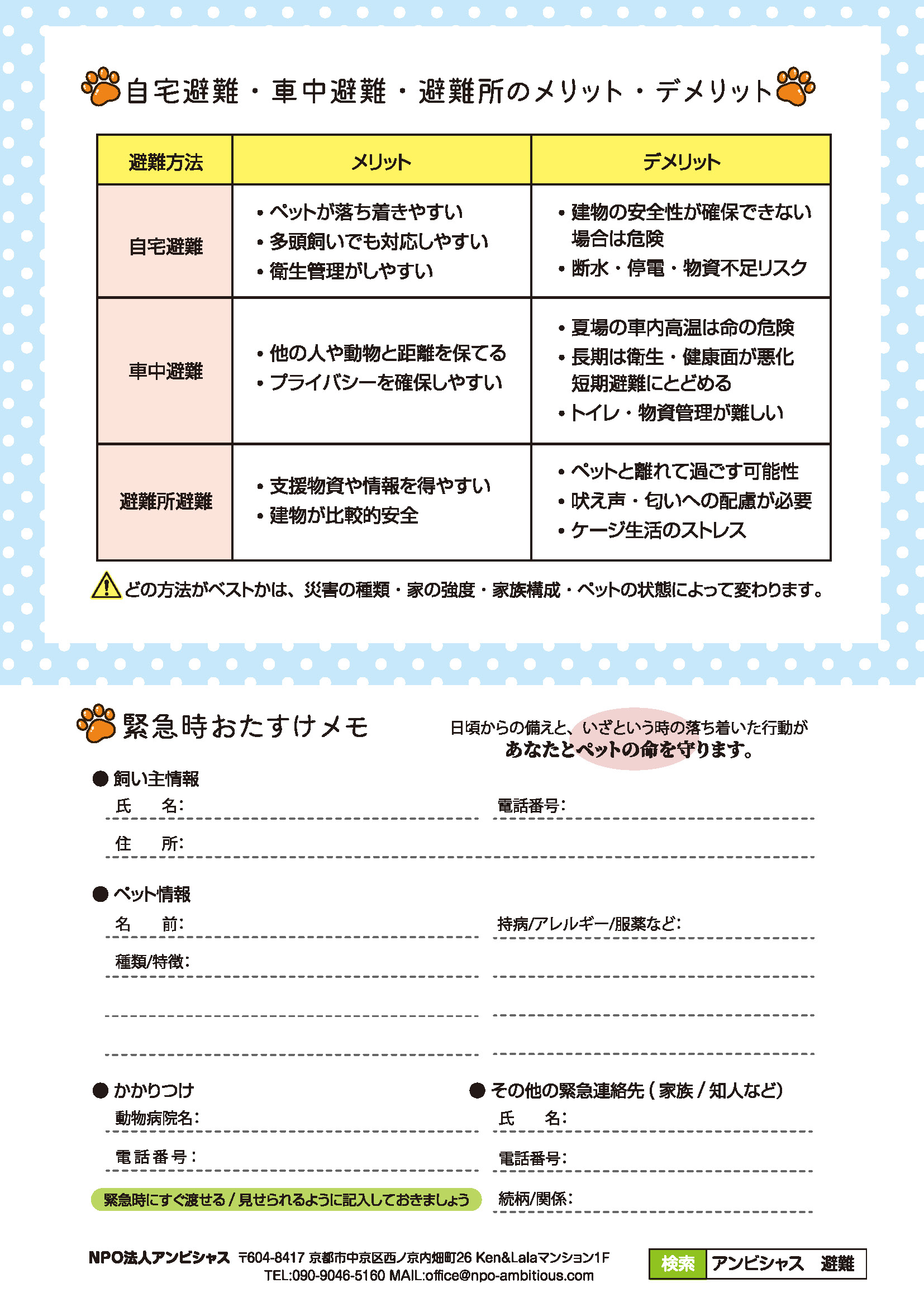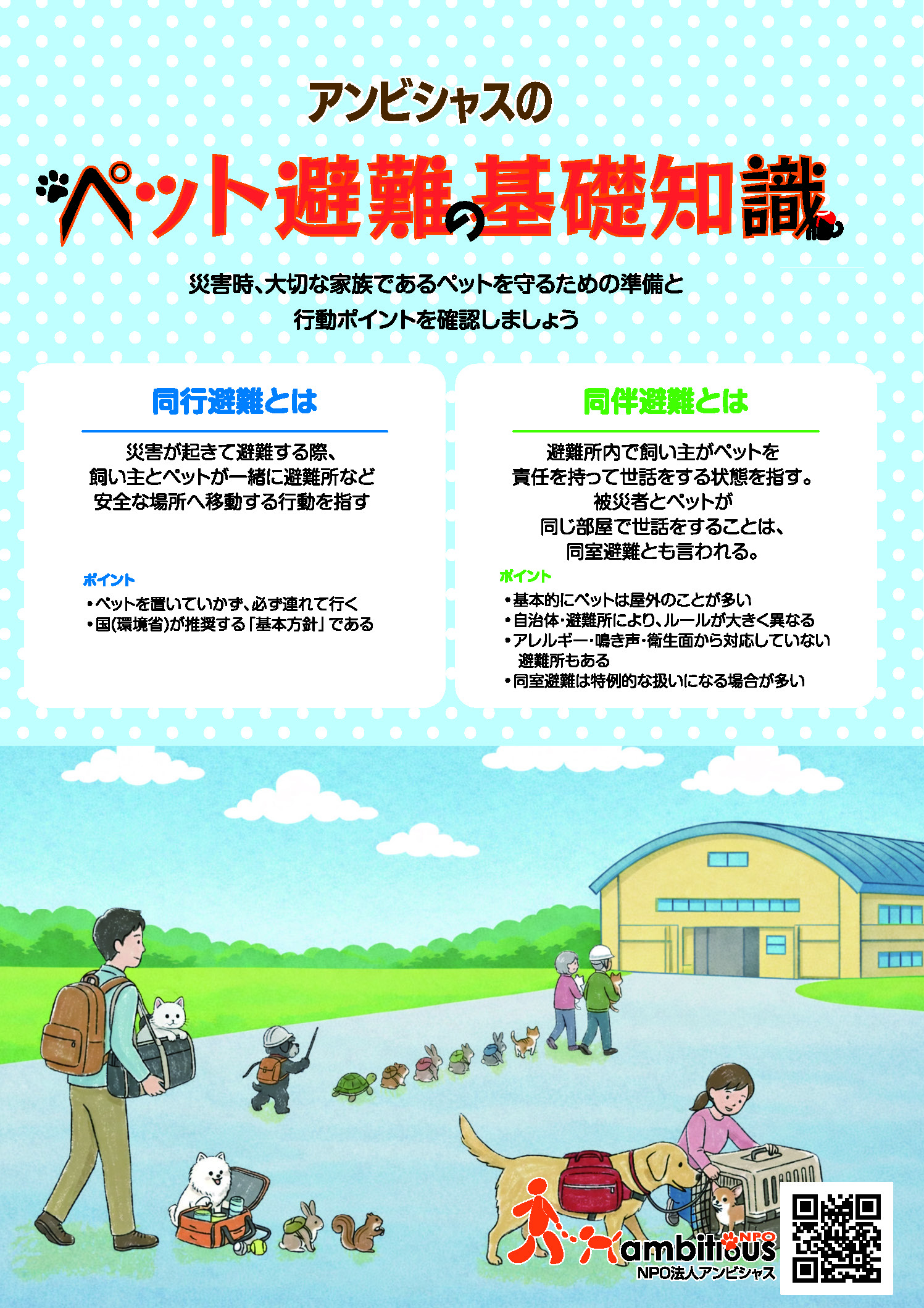アンビシャスの防災まちづくりとして、 「ペットと一緒」同行避難へのとりくみをしています。